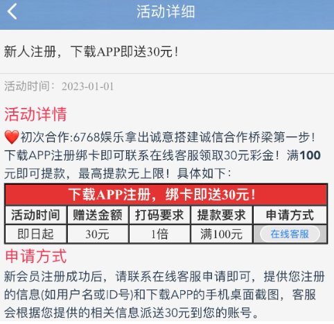 活动详情:新用户先下载app,在注册,完善信息,联系在线客服申请30下载app彩金,满100提现!详细看活动!