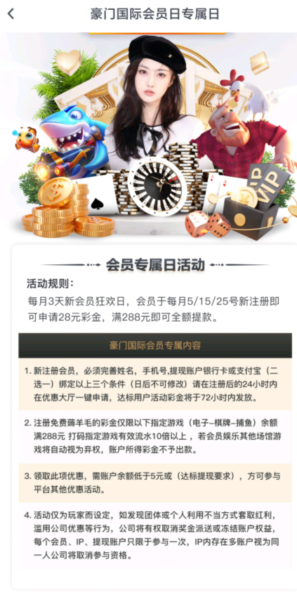 活动详情:注册送28  注册绑定手机号  银行卡或支付宝二选一   绑定后前往【优惠大厅】一键申请  达标会在72小时内发放  请在24小时之内申请  专属会员日每月5/15/25号新注册即送28彩金。
