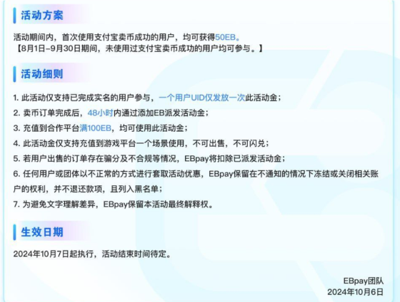 活动详情:找一个支持提ebpay的台子提款一-百, 然后用支付宝卖了之后,会在48小时之内派送至账户50eb,只能充台子不可出售