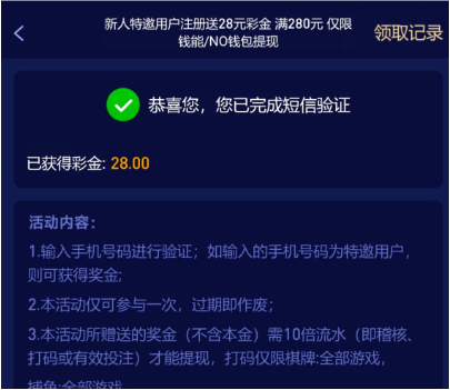 活动详情:短信特邀碰瓷,自助优惠申请28元,在特邀名单内的秒送,彩金只能玩电子棋牌捕鱼,十倍流水打到280提,只能提钱能钱包,联系出款自测!